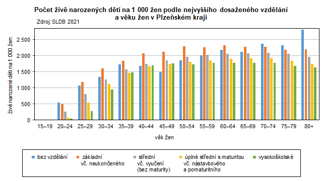 Zajímavé je porovnání žen podle vzdělání a počtu dětí. Nejčastěji jsou matkami ženy se středním vzděláním bez maturity, kterým se narodilo 33,0 % všech dětí v Plzeňském kraji (125 078) a zároveň ženy s úplným středním vzděláním, kde rozdíl v počtu narozených dětí činil pouze 20 dětí. Podíl dětí u žen se základním vzděláním činil 14,8 % a u žen s vysokoškolským vzděláním ještě o 1,6 p. b. méně. S jedním a dvěma dětmi je nejvíce matek s úplným středním vzděláním s maturitou, se třemi a čtyřmi dětmi převažují matky se středním vzděláním vč. vyučení bez maturity. Od pěti dětí více jsou to potom matky se základním nebo neukončeným vzděláním. Nejmenší podíl ve skupině žen se třemi a více dětmi tvoří ženy bez vzdělání (377 žen).