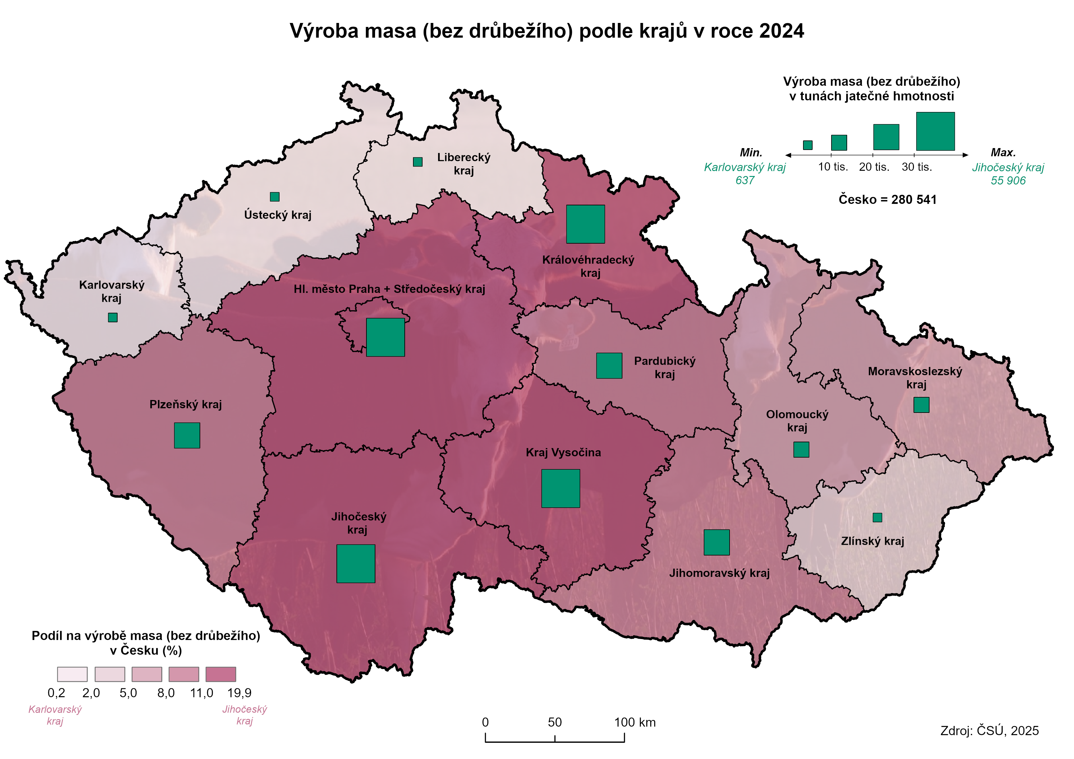 V průběhu roku 2024 bylo v Plzeňském kraji poraženo 30 631 kusů skotu, což bylo o 247 kusů (o 0,8 %) více než v roce 2023. Největší početní nárůst je patrný u krav (o 828 kusů) a u jalovic (o 141 kusů), naopak u býků došlo k výraznému meziročnímu poklesu (o 563 kusů). Celkem bylo v regionu vyrobeno 22,7 tis. tun jatečné hmotnosti masa bez drůbežího, z toho 9,4 tis. tun tvořilo hovězí maso včetně telecího a 13,3 tis. tun maso vepřové.