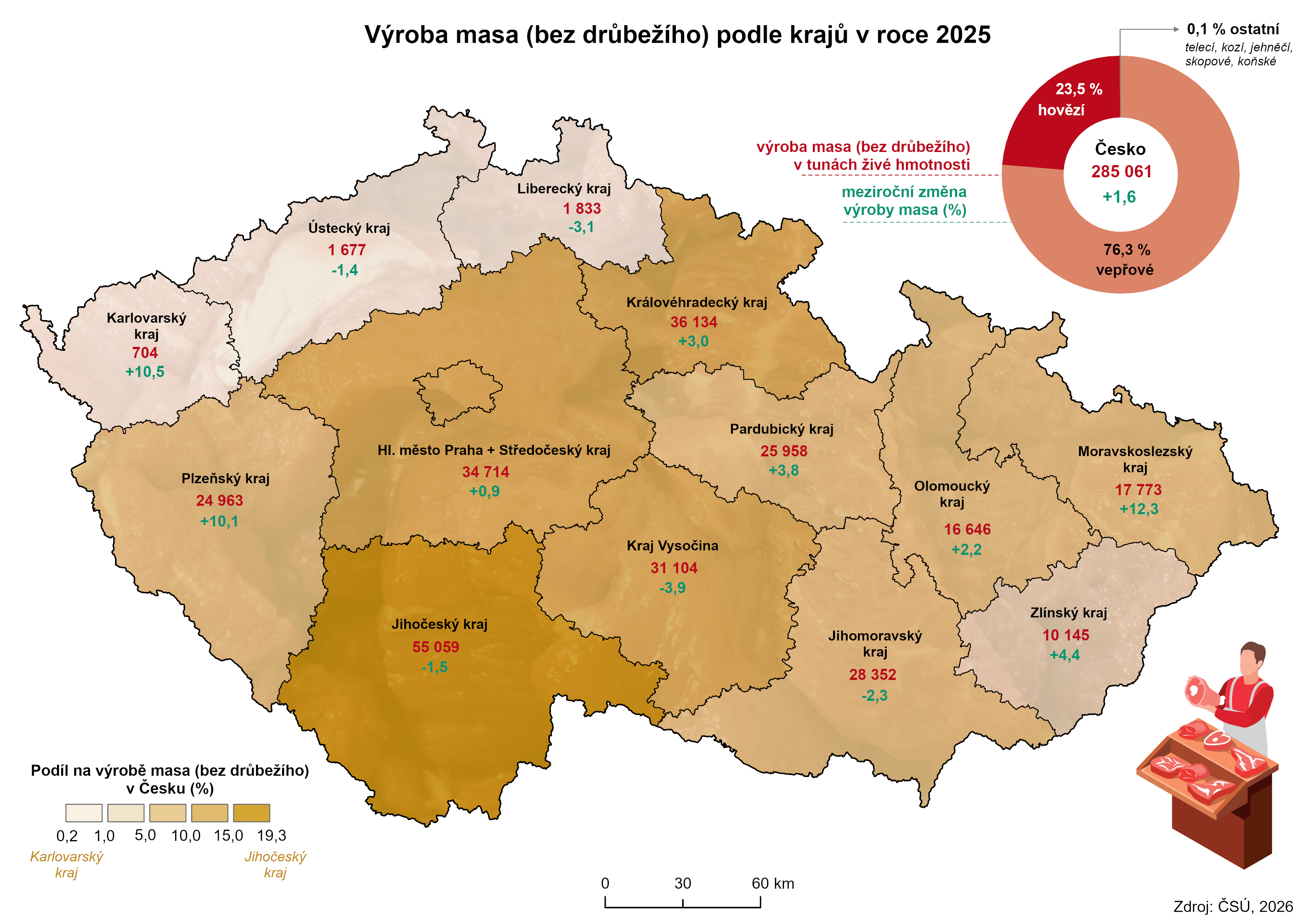 Mezikrajské srovnání také ukázalo, že největší počet poražených prasat byl evidován v Jihočeském kraji (562,7 tis. kusů). Se 158,7 tis. kusy se Plzeňský region zařadil na sedmé místo. Nejvíce vepřového masa bylo tedy vyrobeno v Jihočeském kraji (53,5 tis. tun jatečné hmotnosti), což představuje zhruba čtvrtinu jeho celkové republikové produkce.