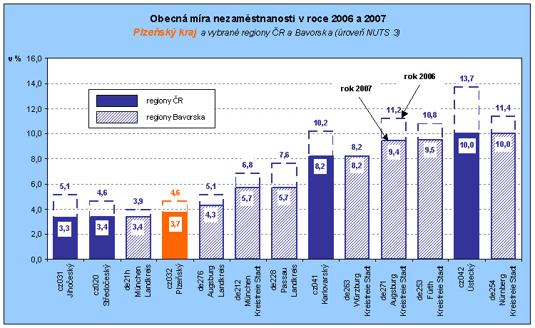 ![]() | Obecná míra nezaměstnanosti v roce 2006 a 2007 Plzeňský kraj a vybrané regiony ČR a Bavorska (úroveň NUTS 3) |