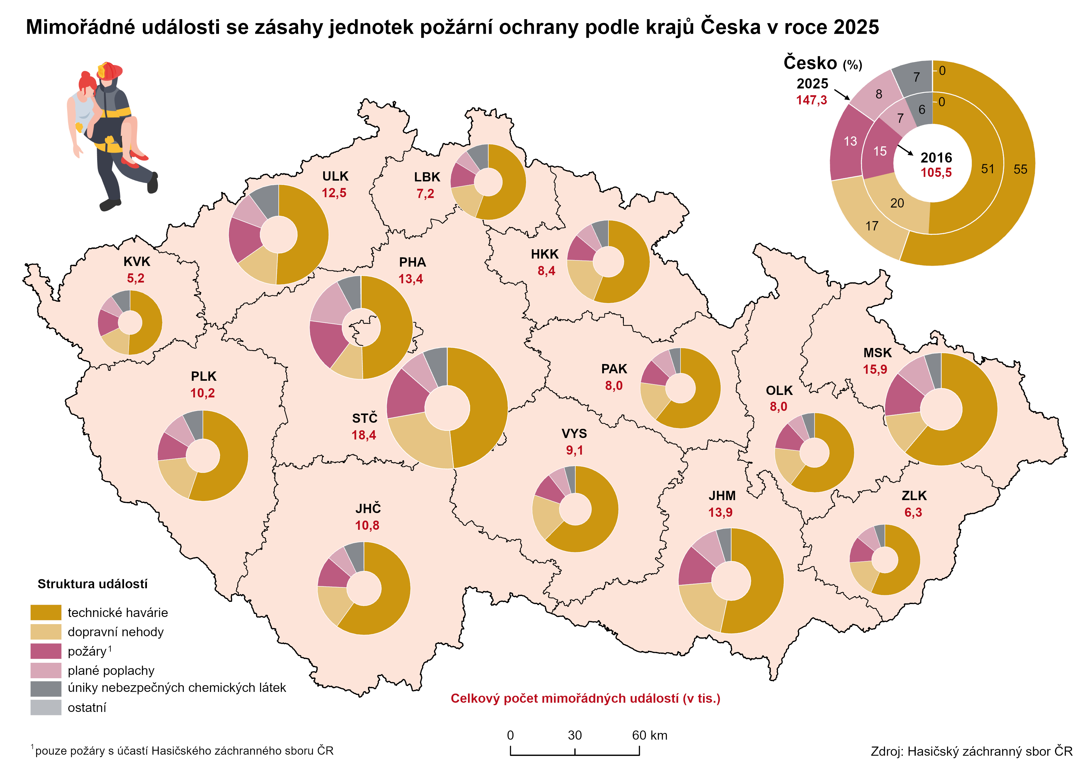 Hasiči za pomoci techniky a vybavení, které mají v rámci jednotek požární ochrany (JPO) k dispozici, chrání životy obyvatel a majetek před požáry. Zároveň poskytují pomoc i při dalších mimořádných událostech, jako jsou živelní pohromy, dopravní nehody, technické havárie nebo úniky nebezpečných látek. Na základě dat Hasičského záchranného sboru ČR zasahovaly jednotky v roce 2025 v rámci Česka u 147,3 tis. mimořádných událostí. Ve srovnání s předchozím rokem, který byl poznamenán zářijovými povodněmi v oblastech severní Moravy a Slezska, došlo k poklesu událostí o 18,4 %. Konkrétně v Olomouckém kraji, který byl nejpostiženějším, se počet zásahů JPO snížil téměř na polovinu. Pokles zaznamenal i Plzeňský kraj, kde jednotky poskytly pomoc u 10,2 tis. událostí, což bylo po klimaticky proměnlivém roce 2024, kdy se střídaly vlny sucha a extrémních srážek, o 1,4 tis. méně.