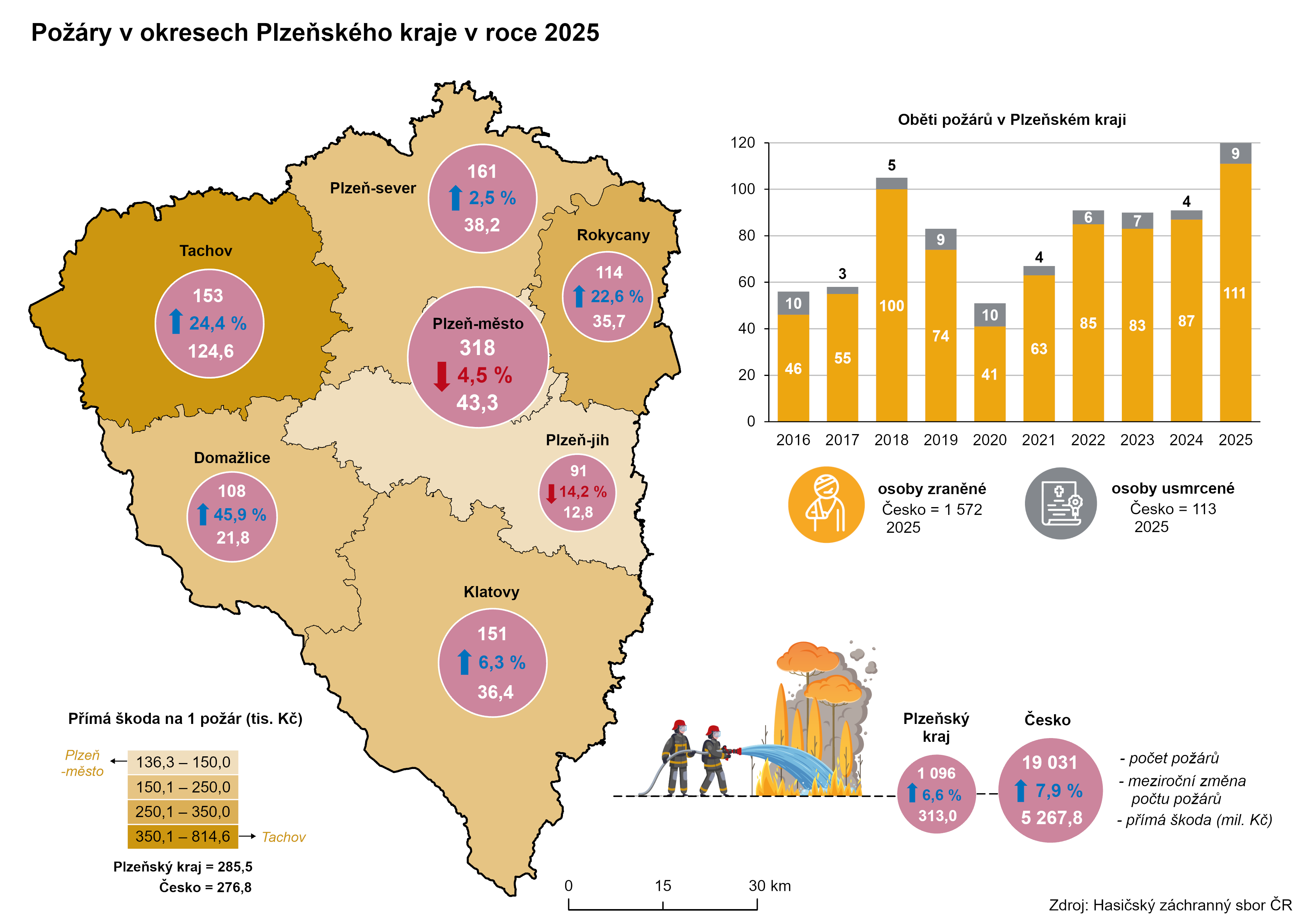 Zcela nesrovnatelným s finanční či majetkovou újmou jsou však zranění osob a ztráty na životech. V rámci Česka bylo v roce 2025 při požárech usmrceno 113 osob, což je o 6 případů více než v roce 2024. V případě Plzeňského kraje byl rok 2025 nejtragičtějším za posledních pět let. Došlo zde k úmrtí 9 osob, nejvíce na Tachovsku (3), kde v přímé souvislosti s již zmiňovaným požárem lakovny zemřeli dva lidé. Z mezikrajského srovnání patřily co do ztrát na životech k nejvíce zasaženým Hl. město Praha a Středočeský kraj, kde shodně zahynulo při požárech 14 osob. Zároveň byl Středočeský kraj regionem s největším počtem zraněných (240). V rámci Česka se v souvislosti s požáry zranilo celkem 1,6 tis. osob, z nichž 111 bylo lokalizováno v Plzeňském kraji. Také byl v regionu mapován meziroční nárůst počtu raněných, a to o 24 osob.
