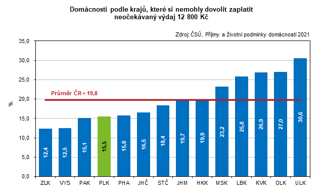 Zaplatit neočekávaný výdaj 12 800 Kč si nemohlo dovolit 15,5 % domácností v Plzeňském kraji, oproti průměru ČR byl tento podíl nižší o 4,3 p. b. Nejnižší podíl domácností, které nemohly zaplatit neočekávaný výdaj, byl zaznamenán v krajích Zlínském (12,4 %) a Vysočina (12,5 %), a Pardubickém (15,1 %). Největší problém zaplatit tento neočekávaný výdaj měly domácnosti v krajích Ústeckém (30,6 %) a Olomouckém (27,0 %).