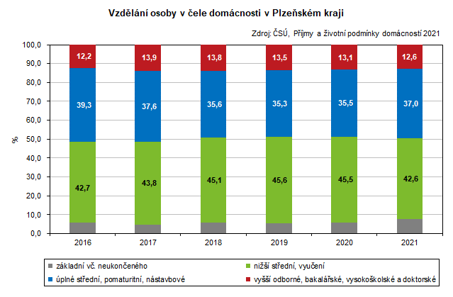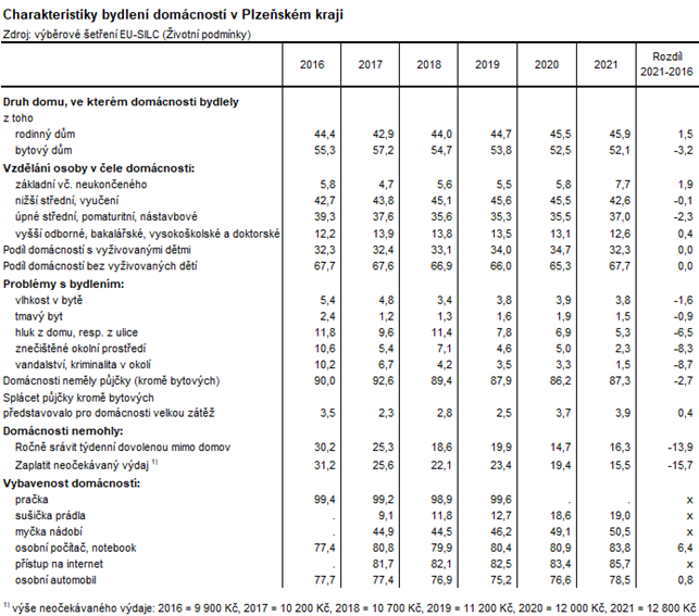 Podíl osob v čele domácností podle vzdělání v Plzeňském kraji se v roce 2021 oproti roku 2016 nejvíce zvýšil ve skupině se základním vzděláním a bez vzdělání, a to o 1,9 p. b. Naopak podíl osob v čele s úplným středním, pomaturitním a nástavbovým vzděláním klesl o 2,3 p. b. V roce 2021 vlastnilo osobní auto 78,5 % domácností v regionu, oproti roku 2016 vzrostl podíl domácností vlastnících osobní automobil o 0,8 p. b. Podíl domácností, které vlastnily počítač nebo notebook, vzrostl ze 77,4 % v roce 2016 na 83,8 % v roce 2021, tj. zvýšení o 6,4 p. b. Splácení půjček (kromě bytových) představovalo v roce 2021 velkou zátěž pro 3,9 % domácností, oproti roku 2016 byl zaznamenán nárůst o 0,4 p. b. Podíl domácností, které neměly půjčky, se snížil z 90,0 % v roce 2016 na 87,3 % v roce 2021, tj. snížení o 2,7 p. b. Podíl domácností, které si nemohly dovolit strávit týdenní dovolenou mimo domov jednou ročně, se v roce 2021 v porovnání s rokem 2016 snížil o 13,9 p. b. Podíl domácností, které nemohly zaplatit neočekávaný výdaj 12 800 Kč v roce 2021, klesl v časové řadě 2016–2021 o 15,7 p. b., přičemž výše neočekávaného výdaje v roce 2016 byla 9 900 Kč.
