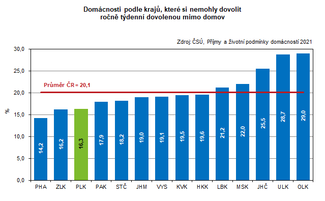 V roce 2021 si nemohlo dovolit strávit týdenní dovolenou jednou ročně mimo domov 16,3 % domácností v Plzeňském kraji (třetí nejnižší podíl mezi kraji), v porovnání s průměrem ČR byl tento podíl nižší o 3,8 p. b. Nejvyšší podíl domácností, které si nemohly dovolit týdenní dovolenou mimo domov ve sledovaném období, byl zjištěn v krajích Olomouckém (29,0 %) a Ústeckém (28,7 %), naopak nejnižší podíl se vyskytoval v Hl. městě Praze (14,2 %) a Zlínském kraji (16,2 %).