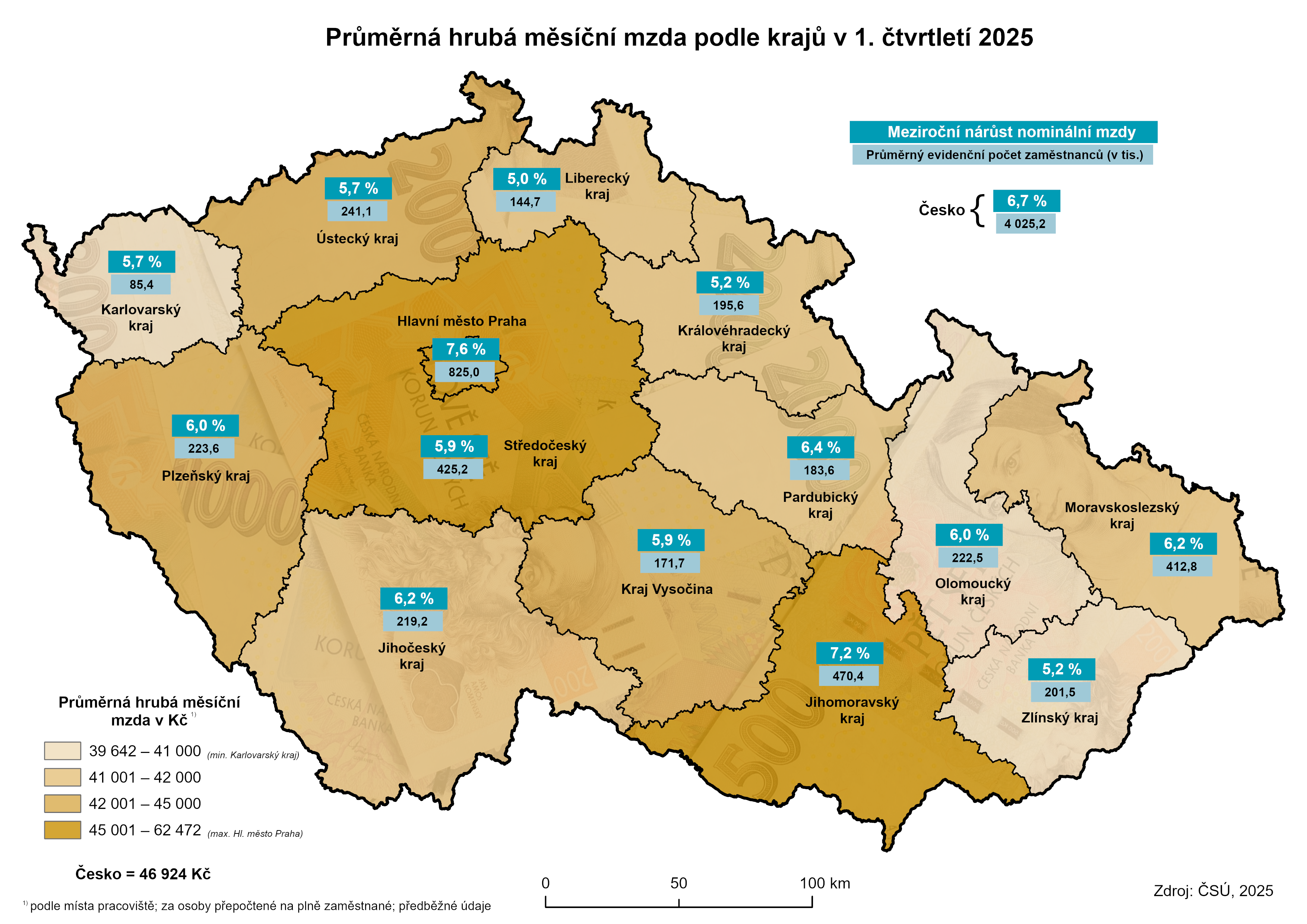 V Plzeňském regionu došlo v 1. čtvrtletí roku 2025 k druhému nejvýraznějšímu meziročnímu navýšení počtu zaměstnanců mezi kraji. Mzda za toto období nominálně i reálně vzrostla a region se s její výší opět zařadil na čtvrtou pozici.
