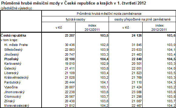 Průměrná hrubá měsíční mzda na fyzické osoby nezohledňuje délku pracovního úvazku zaměstnanců. Vzhledem k tomu, že v nepodnikatelské sféře pracuje vyšší podíl osob na částečný úvazek, jsou následující srovnání provedena na údajích o průměrné mzdě osob přepočtených na plně zaměstnané, které zohledňují délku pracovního úvazku. Průměrná hrubá měsíční mzda1 osob přepočtených na plně zaměstnané podle nové metodiky2 v 1. čtvrtletí 2012 činila v Plzeňském kraji 22 840 Kč. Oproti 1. čtvrtletí 2011 tak průměrná mzda osob přepočtených na plně zaměstnané vzrostla o 975 Kč, tj. o 4,5%. V tomto ukazateli zaujal Plzeňský kraj také čtvrtou nejvyšší pozici. Vyšší průměrné mzdy přepočtené na osoby plně zaměstnané byly zjištěny pouze v kraji Hlavní město Praha (31 845 Kč), ve Středočeském kraji (23 633 Kč) a v Jihomoravském kraji (23 086 Kč). Průměrná mzda osob přepočtených na plně zaměstnané byla nejnižší opět v Karlovarském kraji a činila 20 501 Kč, což je pouze 85,0% celorepublikové průměrné mzdy.