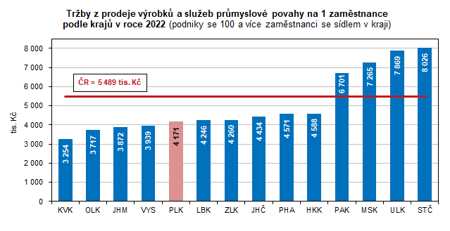 Produktivita práce (podíl tržeb z prodeje výrobků a služeb průmyslové povahy na zaměstnance v běžných cenách) se v Plzeňském kraji zvýšila v roce 2022 na 4 171 tis. Kč. Oproti průměru ČR byla produktivita práce v kraji nižší o 1 318 tis. Kč. Nejvyšší produktivita práce byla dosažena ve Středočeském kraji (8 026 tis. Kč), naopak nejnižší byla zaznamenána v kraji Karlovarském (3 254 tis. Kč). Plzeňský region se řadí mezi kraje s nižší produktivitou práce. Ve všech krajích došlo u tohoto ukazatele k meziročnímu nárůstu. Nejvyšší meziroční zvýšení zaznamenal Ústecký kraj (o 24,9 %), naopak nejméně vzrostla produktivita právě v Plzeňském kraji (o 6,0 %).