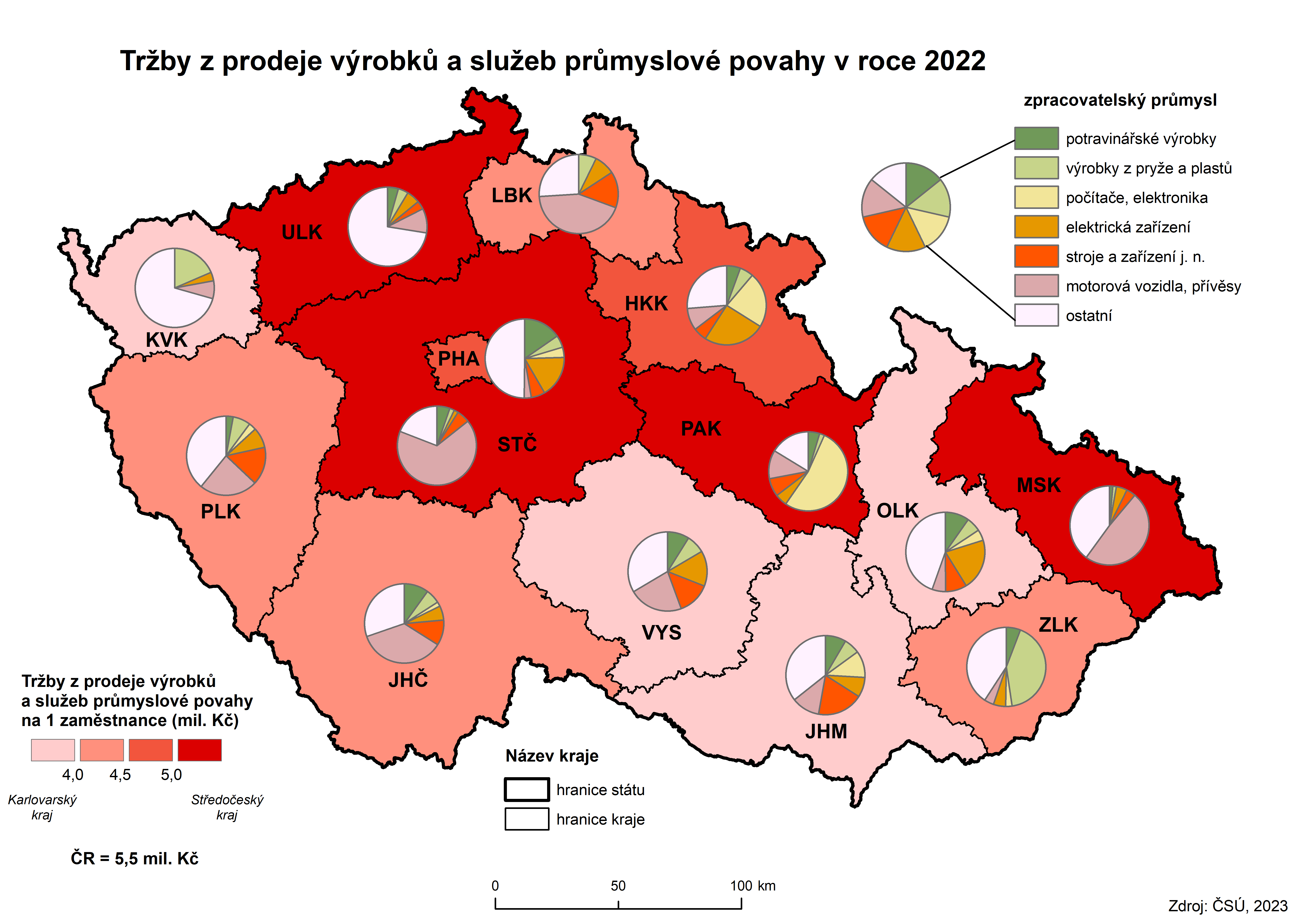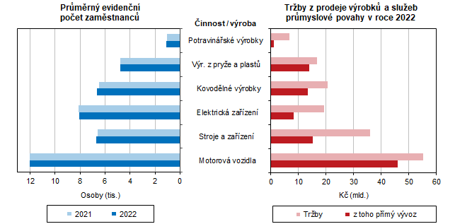 Ve zpracovatelském průmyslu dosáhl objem tržeb z prodeje výrobků a služeb průmyslové povahy v roce 2022 výše 232 202 mil. Kč, což představovalo meziroční nárůst o 7,0 %. Tržby ve zpracovatelském průmyslu představovaly 96,9 % z celkových tržeb v průmyslu. Na výši tržeb ve zpracovatelském průmyslu (po vyloučení individuálních údajů) se výrazněji podílela především odvětví výroby motorových vozidel (kromě motocyklů), přívěsů a návěsů (23,8 %), výroby strojů a zařízení j. n. (15,5 %) a výroby nápojů (10,1 %). Po vyloučení individuálních údajů se meziročně snížily tržby pouze v odvětví výroby ostatních dopravních prostředků a zařízení (o 7,1 %). V ostatních odvětvích byl zaznamenán růst. Nejvíce vzrostly tržby v odvětví výroby potravinářských výrobků, a to o třetinu.