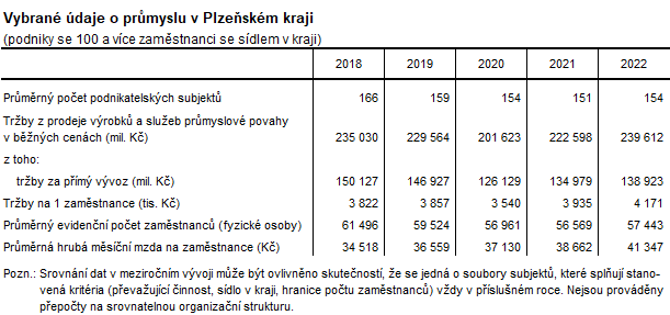 V Plzeňském kraji se v roce 2022 oproti předchozímu roku zvýšil počet velkých průmyslových podniků (se 100 a více zaměstnanci se sídlem na území kraje) o 3 subjekty na 154. Také průměrný evidenční počet zaměstnanců (fyzické osoby) se meziročně zvýšil, a to o 874 zaměstnanců (nárůst o 1,5 %). V mezikrajském porovnání průměrného evidenčního počtu zaměstnanců byl Plzeňský kraj s 57 tis. zaměstnanci na šestém místě. Tito zaměstnanci v kraji tvořili podíl 7,0 % z průměrného evidenčního počtu zaměstnanců v ČR. Od roku 2018 poklesl v kraji průměrný evidenční počet zaměstnanců o 4 053.