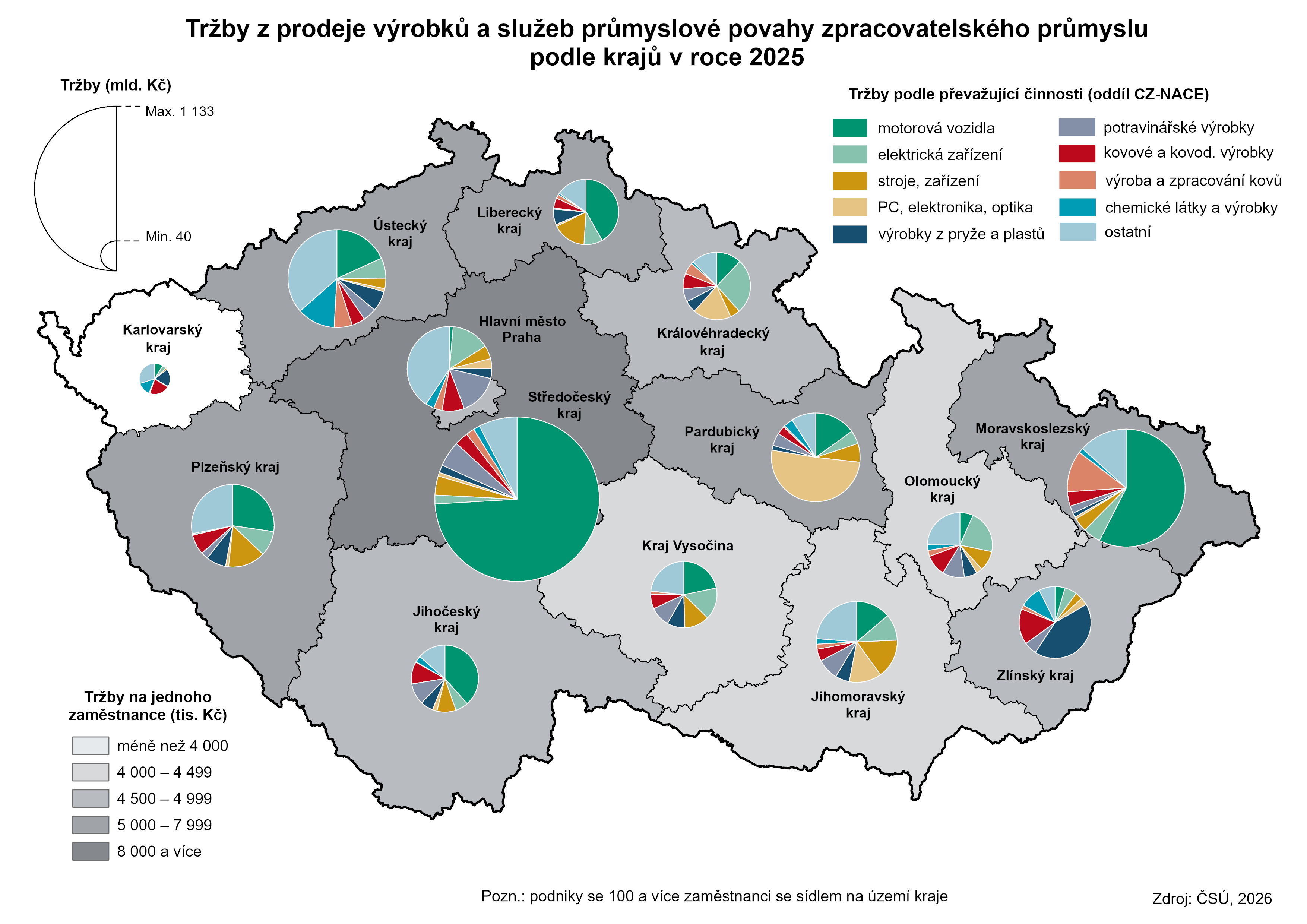 Rozhodující objem tržeb vytváří zpracovatelský průmysl. V Plzeňském kraji ho v roce 2025 reprezentovalo 152 podniků se 100 a více zaměstnanci, jejichž tržby se na tržbách průmyslu celkem podílely 97,8 %. Tržby ze zpracovatelského průmyslu činily 285 661 mil. Kč a meziročně vzrostly o 6,7 %, oproti předchozímu roku tempo růstu značně zrychlilo. V roce 2025 se tržby zvyšovaly nejvíce v odvětvích (po vyloučení důvěrných údajů) výroby strojů a zařízení, výroby ostatních dopravních prostředků a zařízení a výroby elektrických zařízení. Meziroční pokles se týkal pouze výroby nápojů a ostatního zpracovatelského průmyslu. Nejsilnějším odvětvím zpracovatelského průmyslu v Plzeňském regionu je výroba motorových vozidel (kromě motocyklů), přívěsů a návěsů, jehož tržby z prodeje dosáhly v roce 2025 hodnoty 77,9 mld. Kč. V době covidu si ale toto odvětví prošlo velmi těžkým obdobím. V roce 2020 zde tržby klesly téměř o 20 % a v roce 2021, kdy už téměř všechna odvětví v kraji vykazovala nárůst tržeb, o dalších necelých 5 %. Teprve v roce 2024 se konečně podařilo dosáhnout předpandemické úrovně. Loňské tržby v plzeňském automobilovém průmyslu rostly o 3,3 % a to i přesto, že byly zatíženy nově zavedenými celními a regulatorními opatřeními ze strany současné americké administrativy. Dalšími významnými odvětvími v Plzeňském kraji je výroba strojů a zařízení podílející se v roce 2025 na tržbách zpracovatelského průmyslu regionu 14,6 % a výroba elektrických zařízení s podílem 9,8 %.