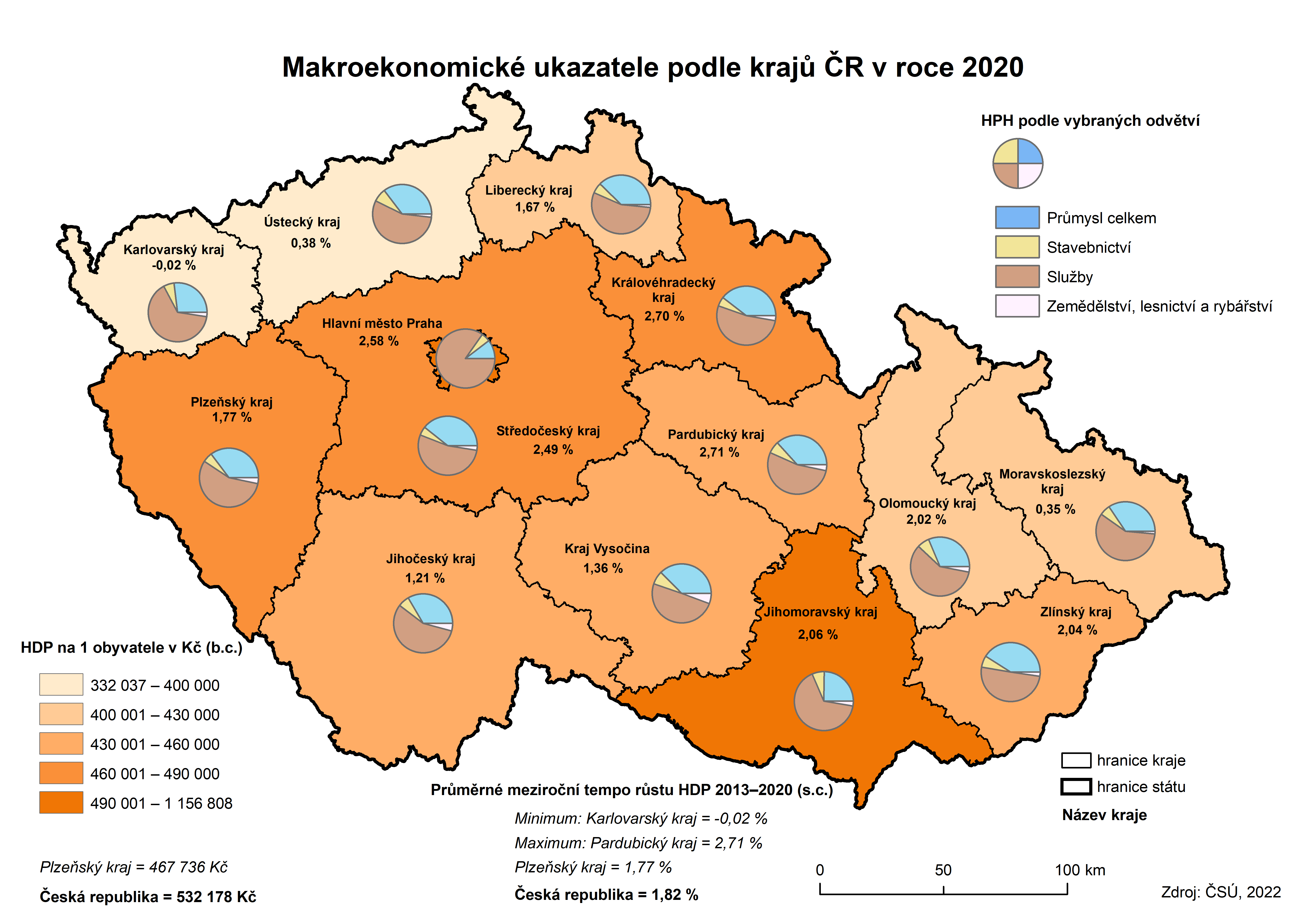 V roce 2020 dosáhl průměr HDP na 1 obyvatele v ČR 532 178 Kč. Vyšší průměr tohoto ukazatele v ČR významně ovlivňuje Hl. město Praha, kde výše HDP na 1 obyvatele v roce 2020 převyšovala průměr celé ČR o 117,4 %. Praha patří v rámci EU k regionům s nejvyšší výkonností hospodářství. Na těchto výsledcích se významnou měrou podílí nejen pracovní síla s vyšší kvalifikací, ale i populace z ostatních regionů, která do Hl. města Prahy dojíždí za prací. Terciární sektor (služby) tvoří významnou součást hrubé přidané hodnoty. V roce 2020 tvořil tento sektor v Hl. městě Praze 84,5 % hrubé přidané hodnoty. Průměr HDP na 1 obyvatele v ČR bez Hl. města Prahy by činil 443 726 Kč a oproti tomuto průměru by byl HDP na 1 obyvatele v Plzeňském kraji vyšší o 24 010 Kč.