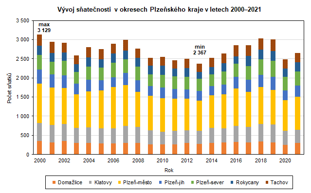 Plzeňský kraj dosáhl nejvyššího počtu sňatků ve sledovaném období v roce 2000 (3 129 sňatků) a také v letech před vypuknutím epidemie covid-19. V roce 2018 bylo sezdáno 3 034 párů a v roce 2019 si své „ano“ řeklo 3 006 párů. V roce 2020 se meziročně snížil počet svateb o 527. Právě v tomto roce došlo k největšímu meziročnímu úbytku sňatků od roku 2000. Naopak nejvyšší meziroční nárůst byl zaznamenán v letech 2004 a 2016 (shodně o 8,3 %). Pro zastánce tradičních hodnot je zajisté pozitivní zprávou, že v roce 2021 došlo po epidemiologické vlně k opětovnému nárůstu počtu sňatků, dosáhl meziročního navýšení o 7,1 %. Nejméně svateb se konalo v roce 2013, a to nejen v Plzeňském kraji, ale v rámci celé České republiky. Zatímco v ČR klesl počet na 43,5 tisíc, Plzeňský kraj zaznamenal pokles na 2 367 sňatků. Možným důvodem neuzavření sňatku v daném roce se mohlo stát pro pověrčivé osoby číslo 13 na konci data.
