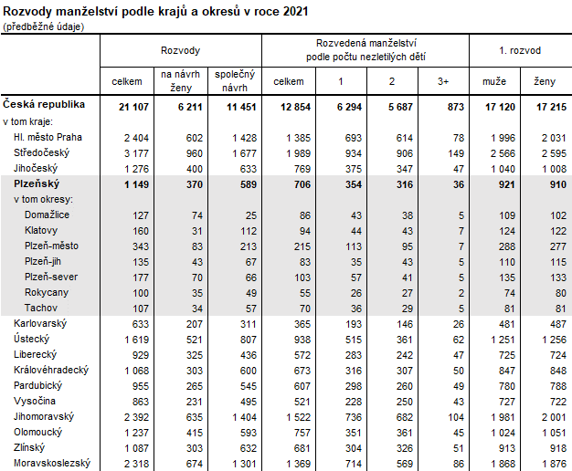 Pozitivní zprávou je, že od roku 2000 se jednalo o vůbec nejnižší počet rozvedených párů. Zatímco v roce 2004 dosáhl ve sledovaném období počet rozvodů nejvyšší hodnoty 33,1 tisíc, v dalších letech se tento trend neustále snižoval. První nelichotivou příčku v počtu rozvedených manželství v roce 2021 obsadil Středočeský kraj, který dosáhl hodnoty 3,2 tisíc rozvodů, následovaly kraje Hl. město Praha, Jihomoravský a Moravskoslezský, kde počet rozvedených párů překonal dvoutisícovou hranici. Plzeňský kraj se zařadil na osmou příčku. Nejméně rozvodů registroval kraj Karlovarský (633).