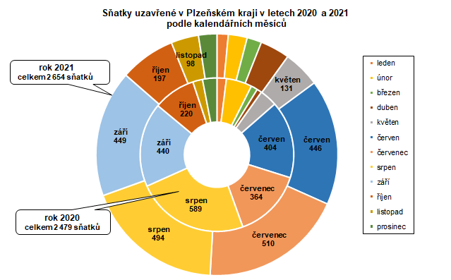 Nejoblíbenějšími daty pro uzavření sňatku se staly v roce 2021 v Plzeňském kraji 21. 8. (119 uzavřených sňatků), 17. 7. (115 uzavřených sňatků) a 28. 8. (110 uzavřených sňatků). Nejvyšší denní počty nově uzavřených manželství byly tradičně zaznamenány o sobotách. Měsíce vybrané pro svatbu v Plzeňském kraji se staly stejně oblíbenými také v celé České republice. Z celkového počtu 46,8 tisíce sňatků v roce 2021 se nejvíce svateb uskutečnilo v srpnu (8 664). Měsícem s druhým nejvyšším počtem uzavřených manželství byl červenec, sezdáno bylo 8 493 párů. Třetím nejoblíbenějším měsícem se stalo září (7 649 sňatků).