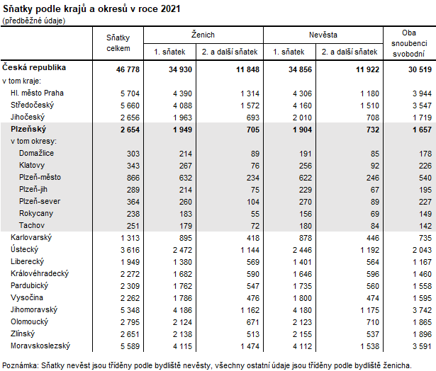 Rostoucí trend sňatečnosti zastavila v roce 2020 epidemie covid-19 a následně přijatá opatření. K opětovnému nárůstu počtu sňatků v Plzeňském kraji došlo až v roce 2021. Téměř jednu třetinu nově uzavřených svazků tvořily ty, ve kterých minimálně jeden z novomanželů vstoupil do druhého či dalšího manželství. Počet rozvodů v kraji byl druhý nejnižší od roku 2000. Více jak polovina z nich byla ukončena na základě společného návrhu a nejvíce manželství mělo v době rozvodu jedno nezletilé dítě.