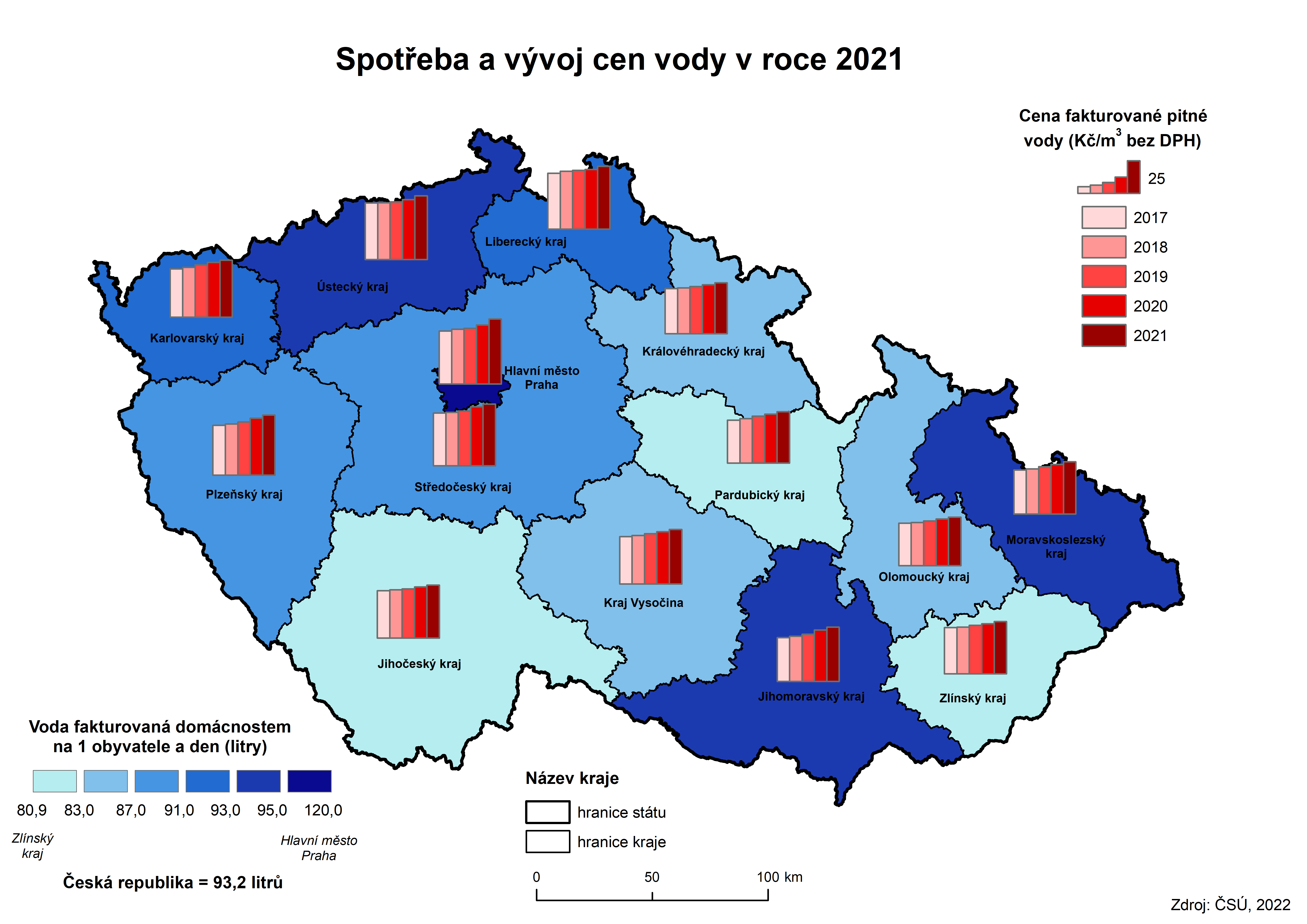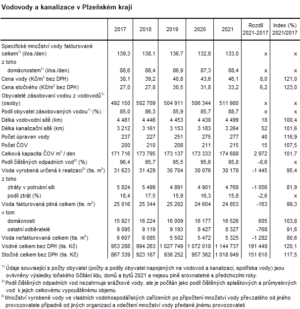 Pozn.: Údaje související s počty obyvatel (počty a podíly obyvatel napojených na vodovod a kanalizaci, spotřeba vody) jsou ovlivněny výsledky loňského Sčítání lidu, domů a bytů 2021 a nejsou plně srovnatelné s předchozími roky.