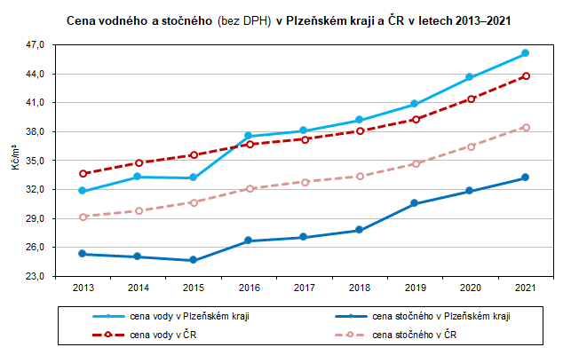 Cena vody (bez DPH) v Plzeňském kraji vzrostla z 38,1 Kč/m3 v roce 2017 na 46,1 Kč/m3 v roce 2021, tj. o 21,0 %. Zvýšení cen vody v Plzeňském kraji bylo v porovnání s ostatními kraji oproti roku 2017 třetí nejvyšší po Praze a Jihomoravském kraji. V ČR dosáhla v roce 2021 cena za vodu 43,8 Kč/m3. V rozmezí let 2017–2020 se v ČR zvýšila cena vody o 17,7 %. V roce 2021 byla nejnižší cena vody zaznamenána v Olomouckém kraji (37,1 Kč/m3) a nejvyšší cena v Hl. městě Praze (49,9 Kč/m3). V porovnání s ostatními kraji byla cena za vodu v Plzeňském kraji pátá.