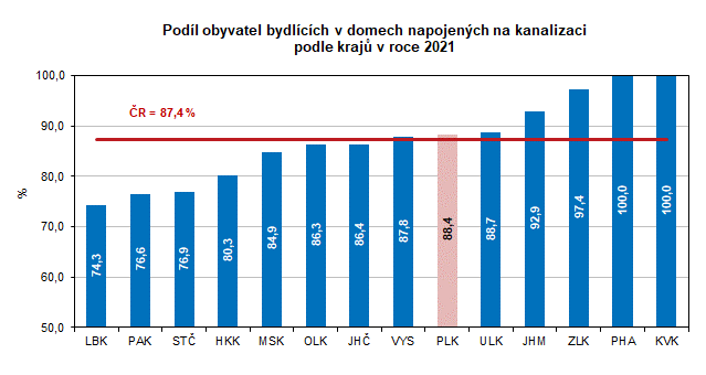V roce 2021 dosáhl podíl obyvatel trvale bydlících v domech napojených na kanalizaci v Plzeňském kraji 88,4 % a byl šestým podílem v rámci krajů. V porovnání s průměrem ČR byl podíl osob napojených na kanalizaci v Plzeňském kraji vyšší o 1,0 p. b. Všichni obyvatelé trvale bydlící v domech byli napojeni na kanalizaci v Praze a Karlovarském kraji. Naopak nejnižší podíly obyvatel bydlících v domech byly napojeny na kanalizaci v krajích Libereckém (74,3 %) a Pardubickém (76,6 %).