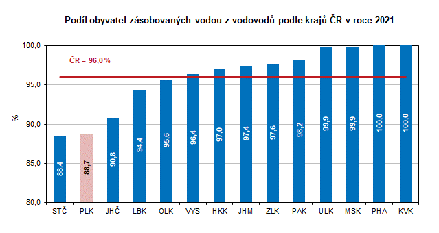 Plzeňský kraj patří ke krajům s nižším podílem obyvatel zásobovaných vodou z vodovodů. V porovnání s ostatními kraji dosáhl druhého nejnižšího podílu obyvatel zásobovaných vodou z vodovodů (88,7 %). Nejméně připojených obyvatel k vodovodní síti měl Středočeský kraj (88,4 %). V Plzeňském kraji byl podíl obyvatel zásobovaných vodou z vodovodů oproti průměru ČR nižší o 7,3 procentního bodu (dále jen p. b.).