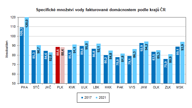 V roce 2021 činilo v Plzeňském kraji specifické množství fakturované vody celkem (domácnosti, průmysl a ostatní spotřebitelé) 133,0 l na osobu a den. Z toho v domácnostech bylo v průměru denně spotřebováno na osobu 88,4 litrů fakturované vody, tj. 66,5 % z fakturované vody celkem. V porovnání s průměrem ČR byla spotřeba vody v domácnostech v Plzeňském kraji nižší o 4,8 l na osobu a den. Nejnižší spotřeba vody v domácnostech byla v roce 2021 zaznamenána ve Zlínském kraji (80,9 l na osobu a den), naopak nejvyšší spotřebu vykazovaly domácnosti v Hl. městě Praze (120,0 l na osobu a den).
