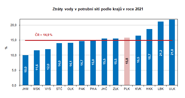 Podíl ztráty vody v potrubní síti představoval pro Plzeňský kraj snížení z 18,4 % v roce 2017 na 15,8 % v roce 2021. Plzeňský kraj se v tomto ukazateli umístil v porovnání s ostatními kraji na pátém místě. Nejvyšší ztráty vody v potrubní síti v roce 2021 byly zaznamenány v krajích Ústeckém (21,8 %) a Libereckém (21,2 %), naopak nejnižší ztrátu měl Jihomoravský kraj (10,0 %). V ČR dosahovala ztráta vody v potrubí 14,9 %, Plzeňský kraj ji překročil o 0,9 p. b.