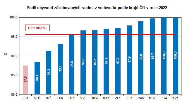 V roce 2022 byl zaznamenán v Plzeňském kraji v rámci mezikrajského porovnání nejnižší podíl obyvatel zásobovaných vodou z vodovodů (87,5 %). Druhý nejnižší podíl měl Středočeský kraj (88,4 %). V Plzeňském kraji byl podíl obyvatel zásobovaných vodou z vodovodů oproti průměru ČR nižší o 8,1 procentního bodu (dále jen p. b.).