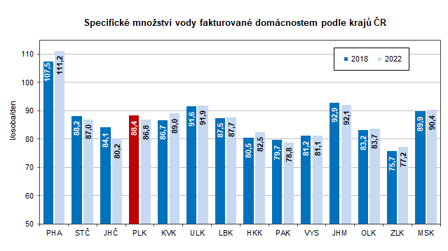 V roce 2022 činilo v Plzeňském kraji specifické množství fakturované vody celkem1 (domácnosti, průmysl a ostatní spotřebitelé) 134,8 l na osobu a den. Z toho v domácnostech bylo v průměru denně spotřebováno na osobu 86,8 litrů vody, tj. 64,4 % z fakturované vody celkem. V porovnání s průměrem ČR byla spotřeba vody v domácnostech v Plzeňském kraji nižší o 2,6 l na osobu a den. Nejnižší spotřeba vody v domácnostech byla v roce 2022 zaznamenána ve Zlínském kraji (77,2 l na osobu a den), naopak nejvyšší spotřebu vykazovaly domácnosti v Hl. městě Praze (111,2 l na osobu a den).