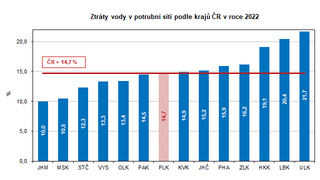 Podíl ztráty vody v potrubní síti představoval pro Plzeňský kraj snížení z 17,5 % v roce 2018 na 14,7 % v roce 2022. V pořadí podle nejnižších ztrát vody v potrubí se Plzeňský kraj v porovnání s ostatními kraji umístil na sedmém místě. Nejvyšší ztráty vody v potrubní síti v roce 2022 byly zaznamenány v krajích Ústeckém (21,7 %) a Libereckém (20,4 %), naopak nejnižší ztrátu měl Jihomoravský kraj (10,0 %). V ČR dosahovala ztráta vody v potrubí stejně jako v Plzeňském kraji 14,7 %.