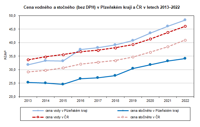 Cena vody (bez DPH) v Plzeňském kraji vzrostla z 39,2 Kč/m3 v roce 2018 na 48,4 Kč/m3 v roce 2022, tj. o 23,5 %. Zvýšení cen vody v regionu bylo v porovnání s ostatními kraji oproti roku 2018 druhé nejvyšší po Ústeckém kraji. V ČR dosáhla v roce 2022 cena za vodu 46,1 Kč/m3 a proti roku 2018 se zvýšila o 21,0 %. V roce 2022 byla nejnižší cena vody zaznamenána v Olomouckém (38,9 Kč/m3) a nejvyšší v Ústeckém kraji (53,8 Kč/m3), Plzeňský kraj se v mezikrajském porovnání zařadil na pátou pozici. V roce 2022 činilo vodné celkem (bez DPH) 1 208 296 tis. Kč a oproti roku 2018 se zvýšilo o 21,5 %.