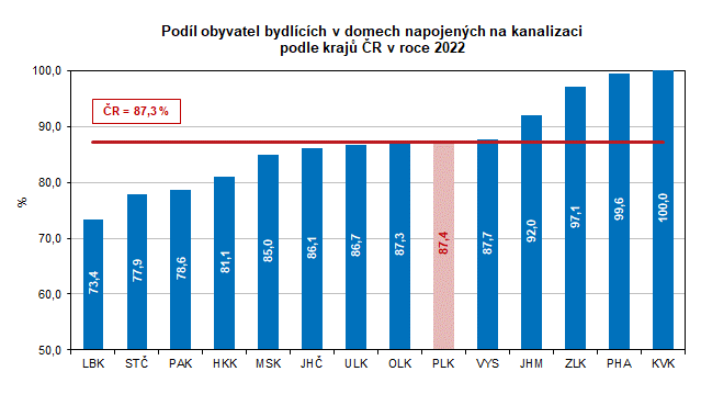 V roce 2022 dosáhl podíl obyvatel trvale bydlících v domech napojených na veřejnou kanalizaci v Plzeňském kraji 87,4 % a byl šestým nejvyšším podílem v rámci krajů. Podíl osob trvale bydlících v domech napojených na kanalizaci dosáhl v Plzeňském kraji a v ČR (87,3 %) téměř stejné výše. Všichni obyvatelé trvale bydlící v domech byli napojeni na kanalizaci v Karlovarském kraji, druhý nejvyšší podíl (99,6 %) byl zaznamenán v Praze. Naopak nejnižší podíly obyvatel byly zaznamenány v krajích Libereckém (73,4 %) a Středočeském (77,9 %).