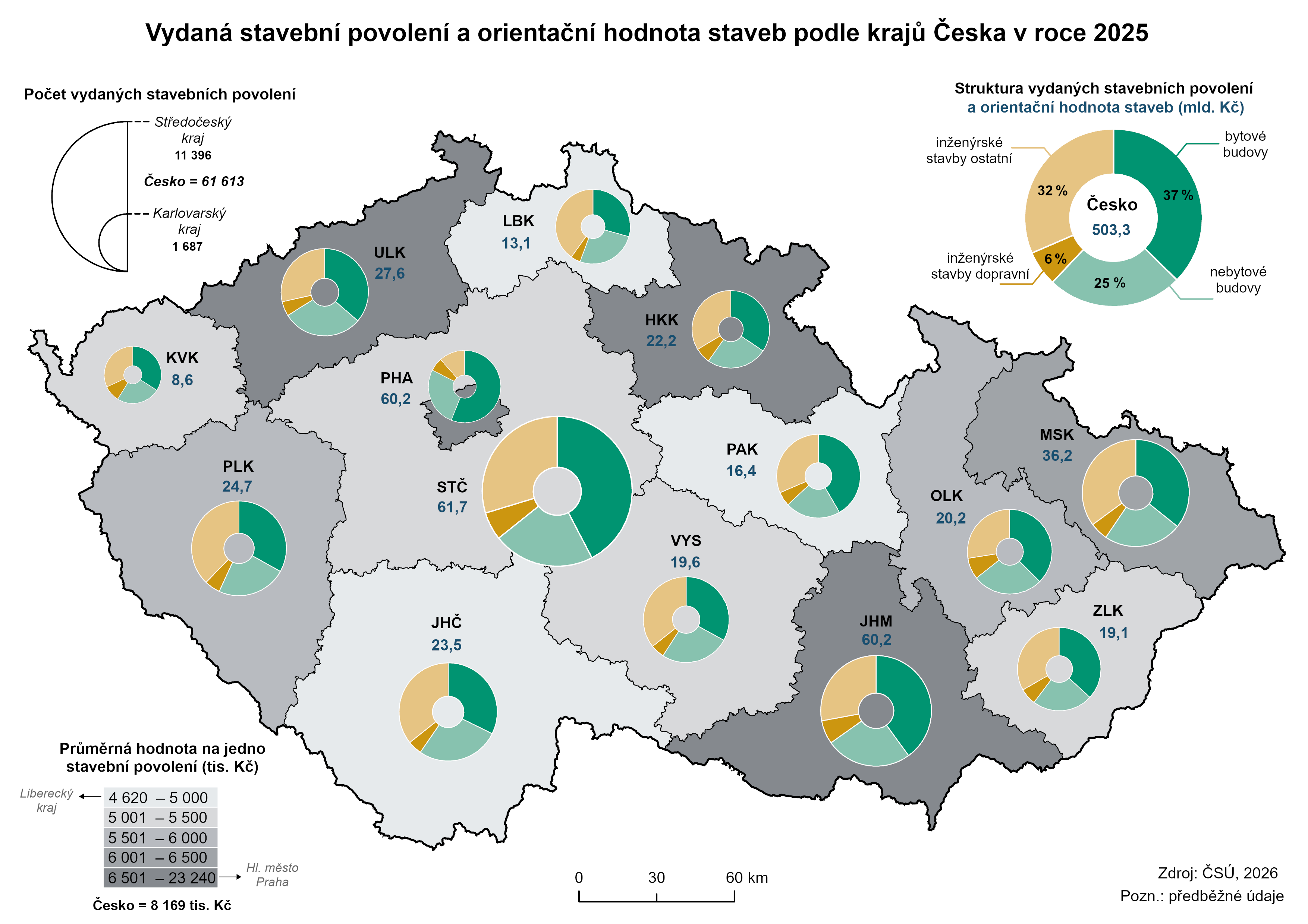 V Česku bylo podle předběžných výsledků vydáno v roce 2025 celkem 61 613 stavebních povolení, oproti předchozímu roku to bylo o 10 453 povolení méně. Nejvíce se vydalo stavebních povolení na inženýrské stavby (37,9 %), na bytovou výstavbu 37,4 % a na nebytovou necelá čtvrtina. Meziročně zůstaly pozice prvních pěti krajů neměnné. Nejvíce stavebních povolení bylo vydáno ve Středočeském kraji (11 396), druhou příčku obsadil Jihomoravský (6 113), na třetí pozici skončil Moravskoslezský (5 748) a na čtvrtém místě Jihočeský kraj (4 726). Plzeňský region byl v počtu vydaných stavebních povolení pátý a měl druhý nejvyšší podíl inženýrských staveb (po Libereckém kraji).