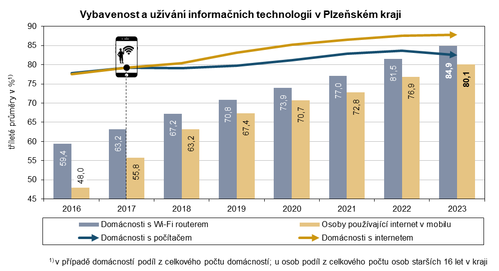 Všechny aspekty moderního života se dnes mohou odehrávat na internetu. Nakupujeme, pracujeme, bavíme se, komunikujeme, a to vše prostřednictvím počítačů, mobilních telefonů a jiných technologií. Právě tento vývoj přispěl k výraznému navyšování vybavenosti domácností, ale také množství uživatelů konkrétních platforem i v Plzeňském kraji. Po období koronavirové pandemie, kdy se potřeba počítačů a vybavenost internetem výrazněji navýšila, je nyní patrný již pozvolnější růst a v případě vybavenosti domácností počítačem v kraji dokonce pokles. Větší preference nyní směřují k připojení prostřednictvím mobilních zařízení. Internet v mobilním telefonu využívalo v roce 2023 v Plzeňském kraji již čtyři z pěti osob starších 16 let, které nejčastěji kombinují připojení prostřednictvím datového tarifu spolu s Wi-Fi.