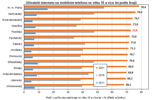 Rovněž roste podíl osob, které používají internet na mobilním telefonu. V roce 2021 jej používalo v Hlavním městě Praze 78,4 % uživatelů (z obyvatel ve věku 16 a více let), v roce 2011 to bylo pouze 16,1 %. K největšímu vzestupu došlo v Moravskoslezském kraji (z 5,9 % v roce 2011 na 74,1 % v roce 2021).