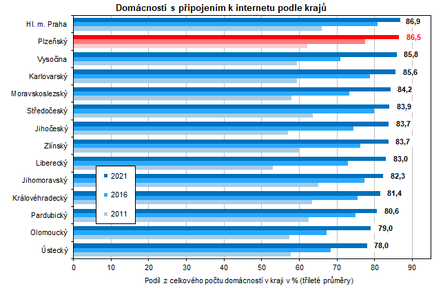 Přestože se podíl domácností vybavených počítačem už v posledních letech nijak výrazně nemění (v roce 2021 představoval 79,5 %), podíl domácností s připojením na internet se stále zvyšuje. V roce 2021 dosáhl v republikovém průměru 83,4 %, nejvíce v Praze (86,9 %), nejméně v Ústeckém kraji (78,0 %).