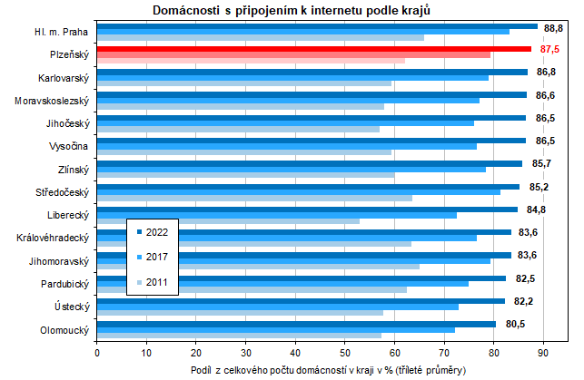 Přestože se podíl domácností vybavených počítačem už v posledních letech nijak výrazně nemění (v roce 2022 představoval 80,7 %), podíl domácností s připojením na internet se stále zvyšuje. V roce 2022 dosáhl v republikovém průměru 85,3 %, nejvíce v Praze (88,8 %), nejméně v Olomouckém kraji (80,5 %).