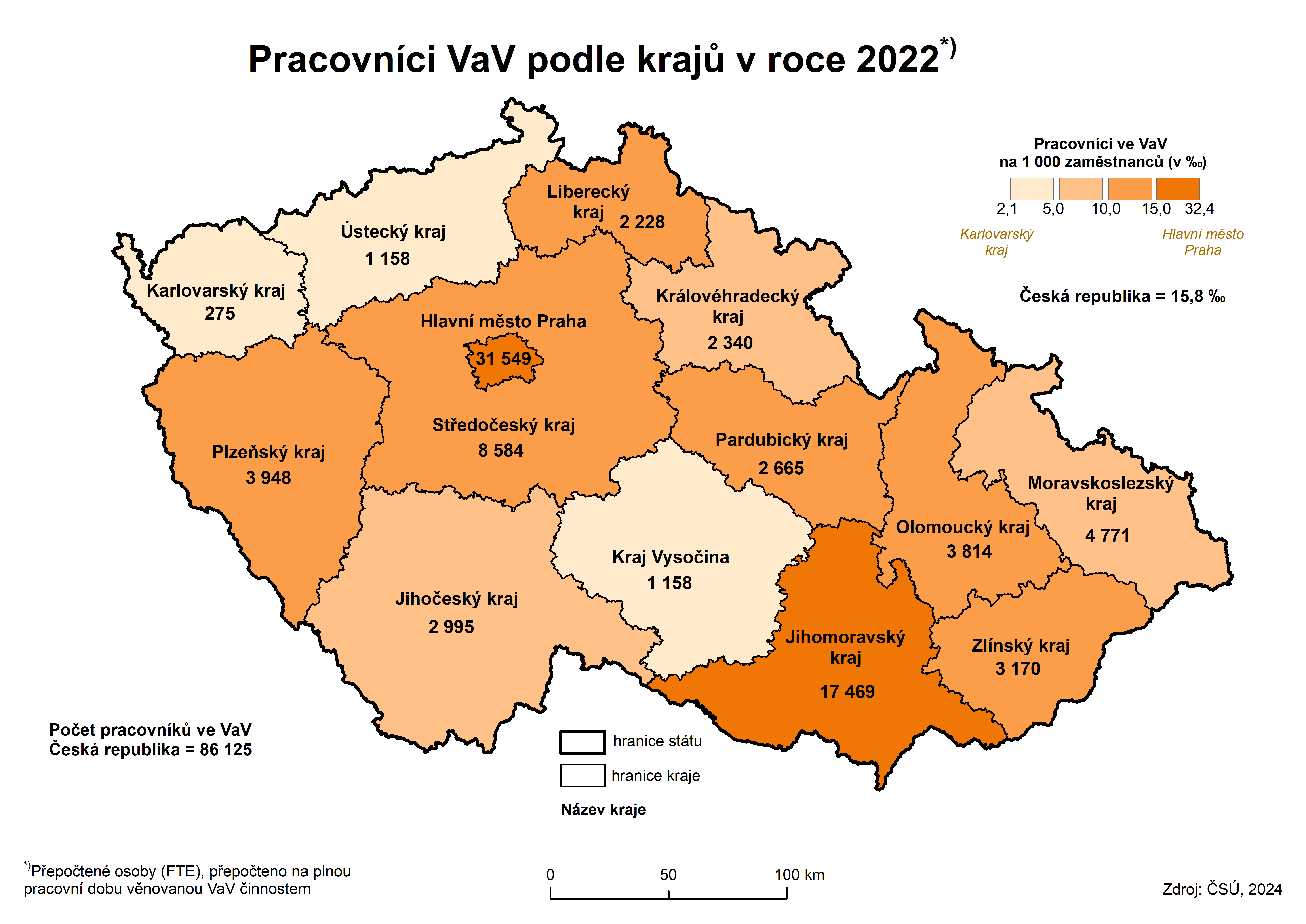 Výzkumem a vývojem (VaV) se v České republice v roce 2022 zabývalo 86 125 osob (přepočteno na plnou roční pracovní dobu věnovanou VaV činnostem). V dlouhodobém pohledu počet těchto zaměstnanců stále roste, ve srovnání s rokem 2021 se zvýšil o 1,7 %. Meziroční nárůst byl zaznamenán v 8 ze 14 krajů republiky, nejvíce v Plzeňském kraji (o 7,1 %). Více než třetina z celkového počtu zaměstnanců působila v Hl. m. Praze (36,6 %), pětina v Jihomoravském kraji a desetina v kraji Středočeském. Naopak ve zbývajících jedenácti krajích podíl na počtu zaměstnanců VaV v České republice nedosáhl 6 %.