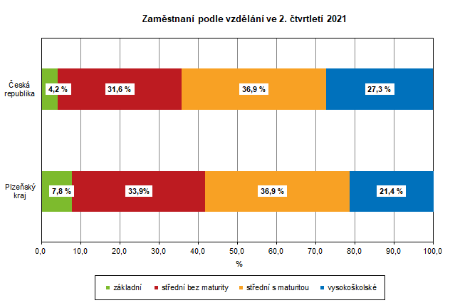 Struktura zaměstnaných podle vzdělání byla v Plzeňském kraji v porovnání s ČR vyšší v základním vzdělání o 3,6 procentního bodu a ve středním vzdělání bez maturity o 2,3 procentního bodu. Podíl zaměstnaných se středním vzděláním s maturitou tvořil 36,9 % z celkového počtu zaměstnaných a byl shodný v kraji i v ČR. Podíl zaměstnaných s vysokoškolským vzděláním byl v Plzeňském kraji oproti ČR nižší o 6,0 procentních bodů.