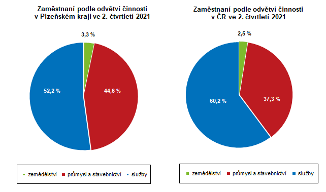 Podíl osob zaměstnaných podle jednotlivých sektorů dosáhl: v primárním sektoru (zemědělství, lesnictví a rybolov) 3,3 %, v sekundárním sektoru (průmysl a stavebnictví) 44,6 % a v terciárním sektoru (služby) 52,2 %. Podíl osob zaměstnaných v jednotlivých sektorech byl v Plzeňském kraji oproti ČR vyšší v primárním sektoru o 0,8 procentní bod a v sekundárním sektoru o 7,3 procentních bodů, zatímco v terciárním sektoru byl nižší o 8,0 procentních bodů.