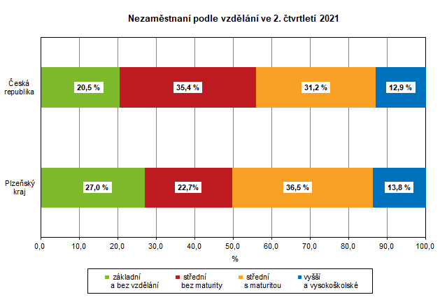 Struktura nezaměstnaných podle vzdělání byla v Plzeňském kraji v porovnání s ČR vyšší u osob se základním vzděláním a bez vzdělání (o 6,5 procentního bodu), se středním vzděláním bez maturity byla nižší o 12,7 procentního bodu a se středním vzděláním s maturitou vyšší o 5,3 procentního bodu. Podíl nezaměstnaných s vyšším a vysokoškolským vzděláním byl v Plzeňském kraji oproti průměru za ČR vyšší o 0,9 procentních bodů.
