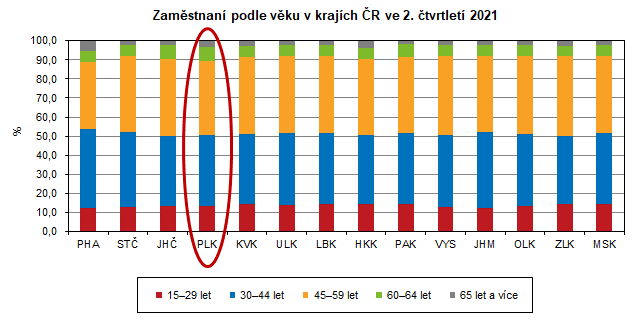 Nejvyšší podíl zaměstnaných dle věkových skupin v Plzeňském kraji (38,8 %) byl ve věku 45–59 let. Druhou nejčetněji zastoupenou skupinu (37,5 %) tvořili zaměstnaní ve věku 30–44 let. Ve věku nad 65 let bylo zaměstnáno 3,3 % osob. Nejvyšší podíl zaměstnaných ve věku 15–29 let byl ve Zlínském kraji (14,7 %), nejnižší pak v kraji Jihomoravském (12,6 %). Ve věkové skupině 65 let a více byl zaměstnán nejvyšší podíl osob v Hl. městě Praze (5,3 %) a nejnižší podíl v Pardubickém kraji (1,8 %).