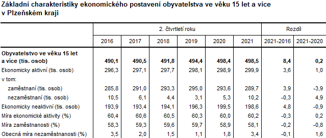 Obyvatelstvo ve věku 15 let a více se v porovnání s 2. čtvrtletím 2016 zvýšilo o 8,4 tis. osob. Počet obyvatel v Plzeňském kraji rostl díky migraci cizinců. V rámci mezikrajského porovnání byl podíl cizinců na obyvatelstvu v Plzeňském kraji třetí nejvyšší. Ekonomická aktivita byla v porovnání s 2. čtvrtletím 2016 vyšší o 3,6 tis. osob. K růstu ekonomické aktivity přispěli zaměstnaní, jejichž počet se zvýšil o 3,9 tis. osob. V rámci časové řady od roku 2016 byl počet nezaměstnaných ve 2. čtvrtletí 2021 druhý nejvyšší. Nejnižší počet nezaměstnaných byl zaznamenán ve 2. čtvrtletí 2019 a činil 3,1 tis. V porovnání s tímto obdobím vzrostl počet nezaměstnaných ve 2. čtvrtletí 2020 více než třikrát. Zvyšující se počet nezaměstnaných byl ovlivněn nepříznivou situací v důsledku pandemie COVID–19. Obecná míra nezaměstnanosti se oproti 2. čtvrtletí 2019 zvýšila o 2,3 procentního bodu. Situace se nevyvíjela příznivě v rostoucím počtu ekonomicky neaktivních obyvatel. Oproti 2. čtvrtletí 2016 vzrostl počet ekonomicky neaktivních ve 2. čtvrtletí 2021 o 4,8 tis. osob. Růst ekonomicky neaktivních obyvatel byl ovlivněn zejména stárnutím populace. Počet obyvatel ve věku 65 let a více se v rozmezí let 2016–2020 zvýšil o 9,5 %. Míra zaměstnanosti se oproti 2. čtvrtletí 2016 snížila o 0,2 procentního bodu.