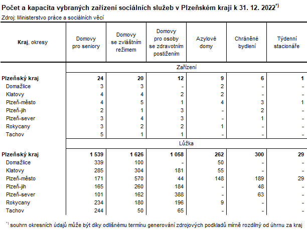 Přestože se v Plzeňském kraji nejvíce domovů pro seniory vyskytovalo v okrese Tachov (5 zařízení), co do počtu lůžek obsadil prvenství okres Domažlice s kapacitou 339 míst. Nejméně domovů pro seniory bylo v okrese Plzeň-jih (2 zařízení se 165 lůžky) a nejmenší lůžková kapacita bylo evidována v okrese Plzeň-sever (101 lůžek ve 3 domovech pro seniory).