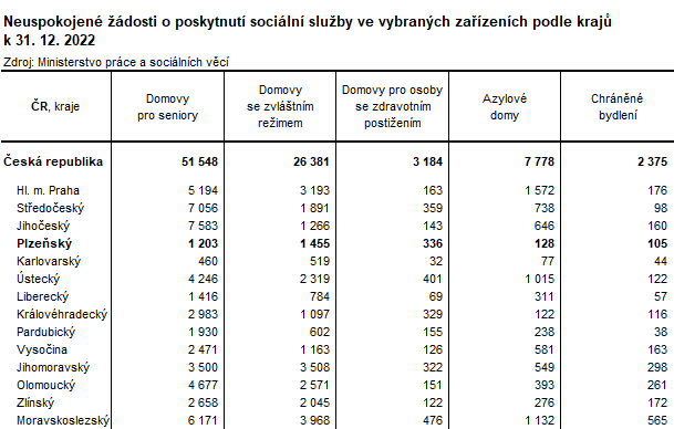 Nejžádanějším druhem pobytových sociálních služeb byly v Plzeňském kraji v roce 2022 domovy pro seniory a domovy se zvláštním režimem. Nejvíce neuspokojených žádostí bylo evidováno v domovech se zvláštním režimem.