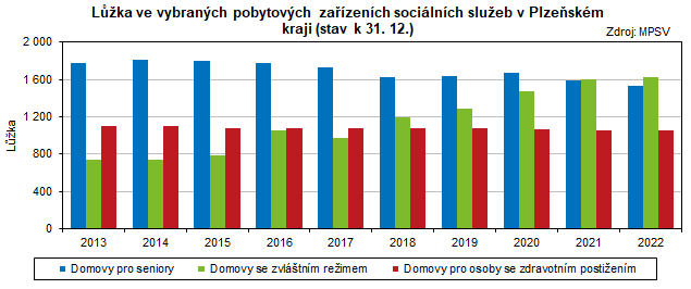 Jednou z legislativně stanovených služeb sociální péče je pobytová služba s celoročním provozem v domovech pro seniory. Tato služba je určena zejména těm seniorům, jimž nelze zabezpečit pomoc v jejich přirozeném sociálním prostředí. V Plzeňském kraji bylo v roce 2022 provozováno 24 domovů pro seniory s 1 495 klienty. Z dlouhodobého pohledu má vývoj počtu lůžek proměnlivý charakter. Meziročně se počet lůžek v domovech pro seniory trochu snížil. K mírnému meziročnímu navýšení došlo v letech 2019 a 2020, nicméně v období 2017 až 2022 se jedná spíše o snížení počtu lůžek. V roce 2022 byl v tomto sledovaném období počet lůžek v kraji vůbec nejnižší. Průměr počtu lůžek na jedno zařízení dosahuje hodnoty 64,0 v kraji, což je méně než průměr za ČR (68,3 lůžek). U tohoto typu zařízení bylo zaznamenáno 1 203 neuspokojených žádostí o sociální služby, meziročně to znamená navýšení o 13,9 %. V mezikrajském porovnání po kraji Karlovarském (0,9 %) byl podíl neuspokojených žádostí v Plzeňském regionu druhý nejnižší (2,3 %). Nejvíce neuspokojených žádostí bylo evidováno v kraji Jihočeském (podíl 14,7 %).