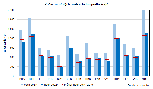 Podle dosud dostupných údajů z hlášení úmrtí zemřelo v lednu 2022 v celé České republice téměř 10,8 tisíc obyvatel, což je o 5 090 osob méně než v lednu 2021. Proti pětiletému průměru z let 2015–2019 došlo jen k mírnému nárůstu, a to o 194 osob (o 1,8 %).