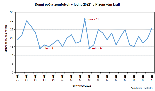 Z celkového počtu zemřelých osob v Plzeňském kraji v lednu 2022 bylo podle předběžných údajů 314 mužů a 308 žen. Celkově zemřelo tento měsíc v porovnání s lednovým pětiletým průměrem roků 2015–2019 o 5,0 % osob více, zvýšení bylo méně patrné u mužů (oproti průměru let 2015–2019 jich zemřelo o 3,6 % více) než u žen (o 6,4 %). Nejhorším dnem z pohledu počtu úmrtí byl 16. leden 2022, kdy v kraji zemřelo 31 osob, nejméně lidí v regionu pak zemřelo 6. a 17. ledna (shodně 14).