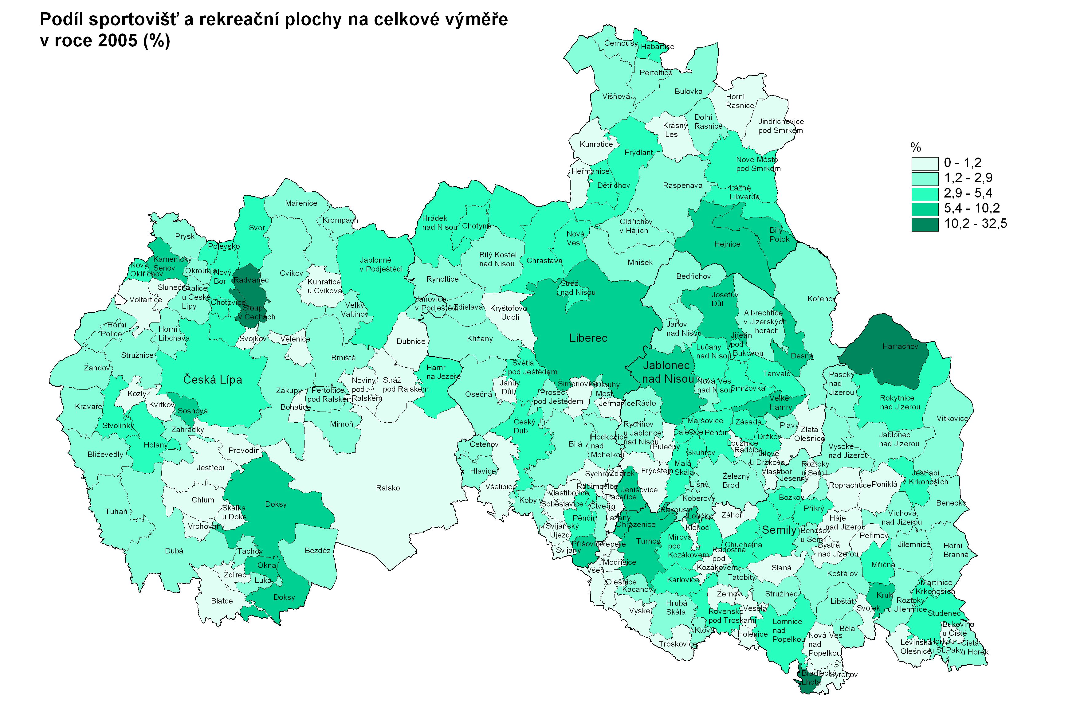 Podíl sportovišť a rekreační plochy na celkové výměře v roce 2005 (%) |