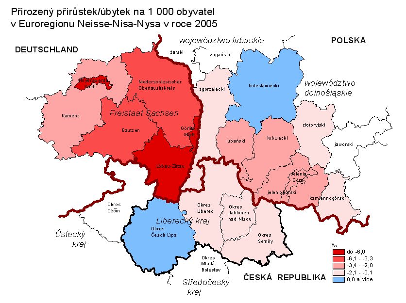 Přirozený přírůstek/úbytek na 1 000 obyvatel v Euroregionu Neisse-Nisa-Nysa v roce 2005 |