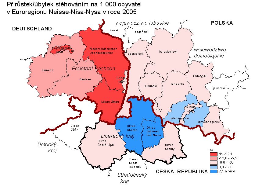 Přírůstek/úbytek stěhováním na 1 000 obyvatel v Euroregionu Neisse-Nisa-Nysa v roce 2005 |